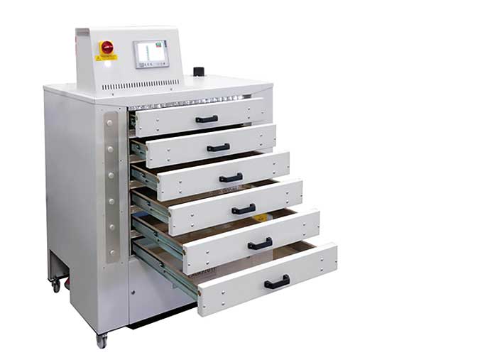 The portfolio includes forced-air dryers for digital printing (e.g. the modular Tetris series), proven screen-printing dryers such as Noir and Fahrenheit, and compact Dido digital drawer ovens for labs and shops. The range is complemented by flash cures with advanced temperature control and innovative systems like the Speedy-T folding and packaging machine.