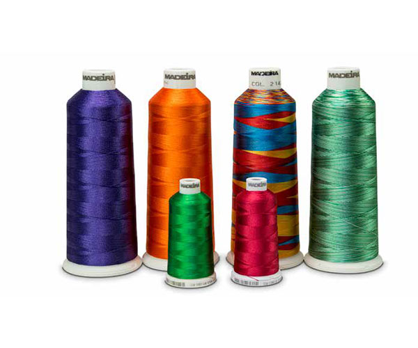 The portfolio includes viscose and polyester embroidery threads, metallic and wool speciality threads, technical yarns such as conductive and flame-resistant types, as well as underthreads, backings, toppings, and needles. These products are designed for reliable use on industrial embroidery machines across a wide range of applications.